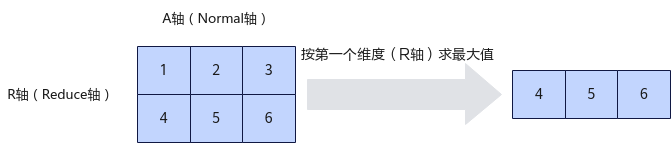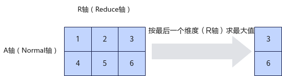 定义指定计算的维度(Reduce轴)为R轴,非指定维度(Normal轴)为A轴。如下图所示,对Shape为(2, 3)的二维矩阵进行运算,指定在第一维求最大值,输出结果为[4, 5, 6];指定在第二维求最大值,输出结果为[3, 6]。