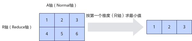 定义指定计算的维度(Reduce轴)为R轴,非指定维度(Normal轴)为A轴。如下图所示,对Shape为(2, 3)的二维矩阵进行运算,指定在第一维求最小值,输出结果为[1, 2, 3];指定在第二维求最小值,输出结果为[1, 4]。