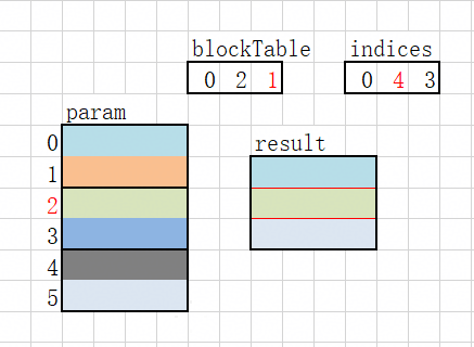考虑以上场景,indices为topk结果,block_table为Page Attention的页表,param 为 kv cache,block_size为2。最终的结果是将token的kv cache 收集起来。