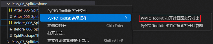 在Visual Studio Code工作区,右键单击计算图文件,例如xx.json,在弹出的菜单中选择“PyPTO Toolkit:高级操作”,在展开的二级菜单中选择“PyPTO Toolkit:打开计算图差异对比”。