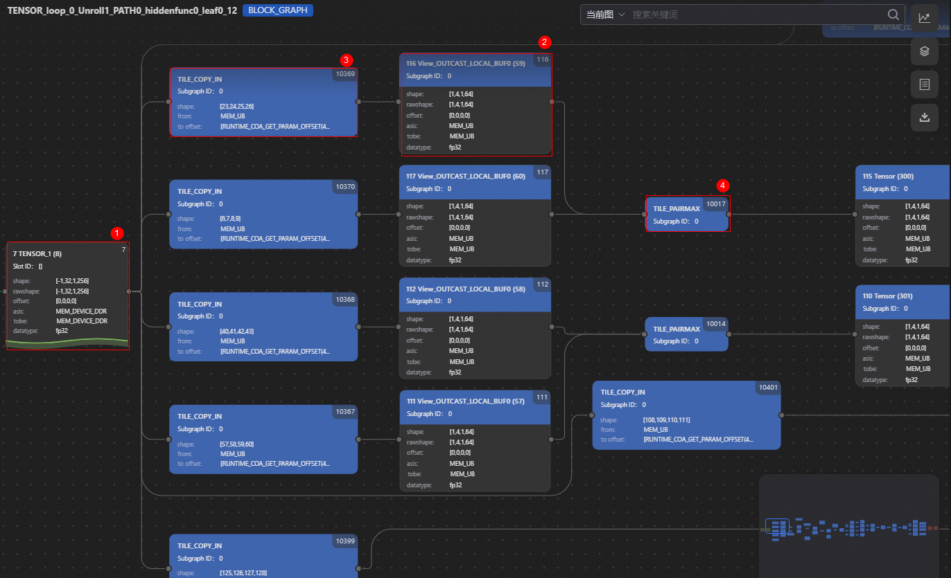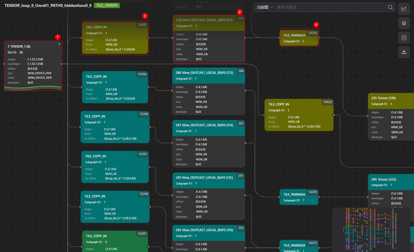 从图中可以看到,相比于Tile展开前,Tile Graph中增加了很多节点,这是因为原Shape为(-1, 32, 1, 256)的Tensor经过Tile展开,切分成Shape为(1, 4 ,1, 64)的Tile。同时,为Tile分配内存层级(对应图中asis-原地址,tobe-目的地址),并将Tensor前后关联的Operation节点进行切分和处理(例如图中TILE_COPY_IN和TILE_COPY_OUT等)。