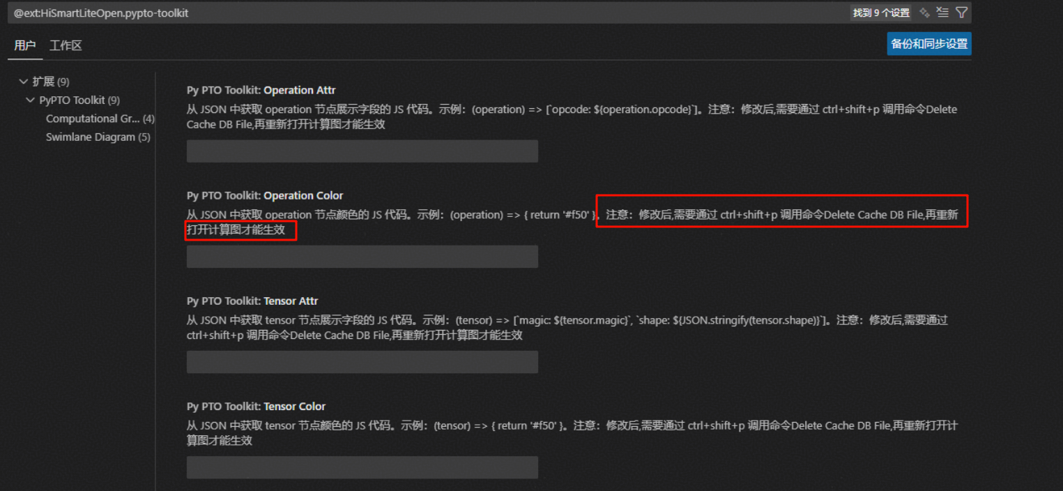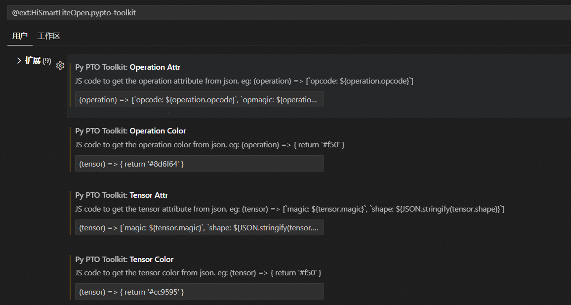 在Visual Studio Code工作区,右键单击PyPTO Toolkit插件名称,选择“设置”,进入配置面板界面。