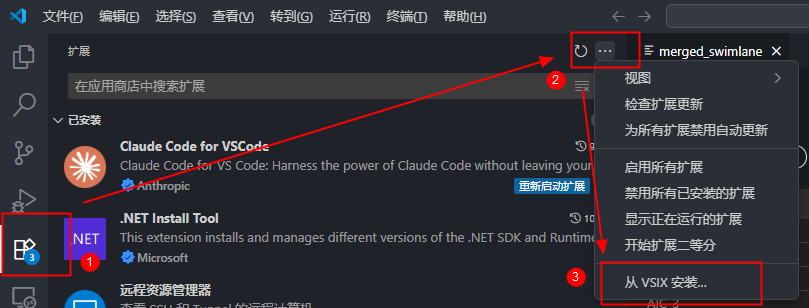 安装# 前提条件# 已安装Visual Studio Code,版本要求为不低于1.94.1。 操作步骤# PyPTO Toolkit插件的安装步骤如下: 单击LINK下载插件。 打开Visual Studio Code,进入“扩展”选项卡界面,单击右上角的“…”,选择“从VSIX安装…”。 图 1 安装PyPTO Toolkit插件 选择.vsix插件文件,完成安装。