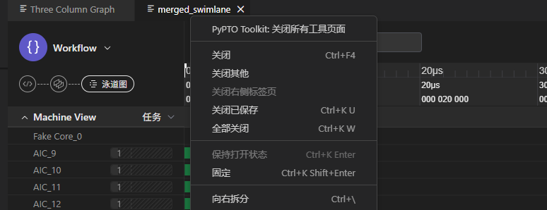 其他功能# 一键关闭插件所有页面# 功能说明# 当工具打开的页面较多时,如果需要一次性关闭所有工具生成的页面,可以通过“PyPTO Toolkit: 关闭所有工具页面”菜单来一键关闭插件打开的所有页面。 前提条件# 执行PyPTO程序,正常生成泳道图,计算图或者三栏联动视图 操作步骤# 在任意工具生成的页面的文件栏处,右键点击 ”PyPTO Toolkit: 关闭所有工具页面”菜单功能,即可一键关闭所有工具生成页面。