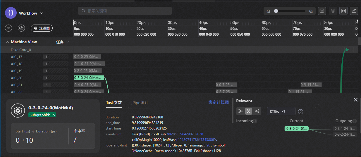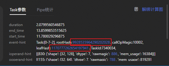 单击rootHash值,可跳转到该任务对应的Execute Graph,便于查看该任务的前后依赖关系。进而通过callOpMagic可定位到Call Operation节点,即该任务对应的Block Graph。