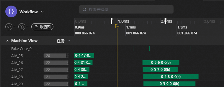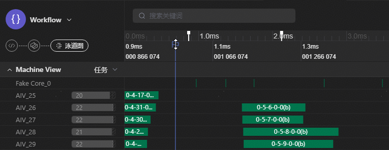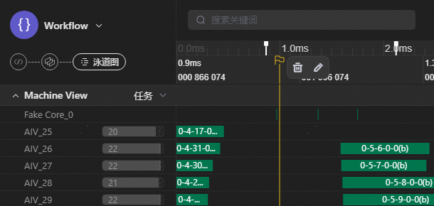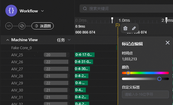 在时间轴上单击,添加时间观测线,可用于辅助观测泳道图。