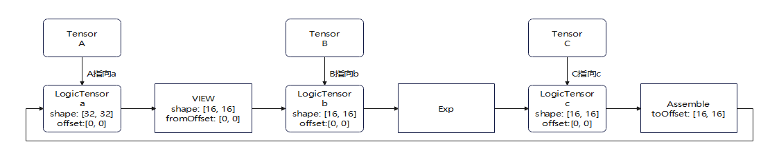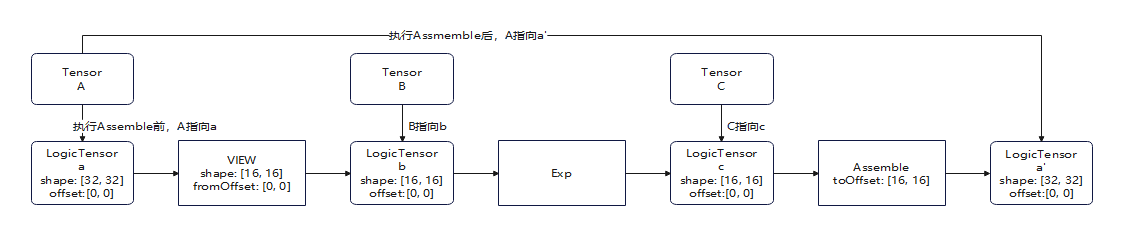 由于pypto描述的是一个图表达,在读取和写入的时候,当前认为a是一个整体,因此创建的连接关系会形成一个环路,即a->b->b.exp()->a,而pypto不允许构造出的图内存在环路,必须为DAG(有向无环图),所以才有这个报错。
